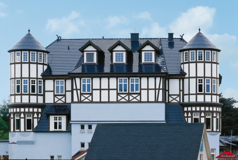 Красивое, универсальное и самое трудоемкое керамическое покрытие кровли. С черепицей Biber 17,5х38 ангоб рустикальный, engobe Rustikal Meyer-Holsen можно творить настоящие чудеса. Это многократно доказано великолепными объектами, кровли которых покрыт черепицей Бобровый хвост. Этой черепицей можно выполнить рисунок на кровле и покрыть кровлю любой сложности, включая башни, конусы практически любого радиуса, включая сложные выпуклые или вогнутые участки, ендовы и примыкания. Именно с помощью черепицы Biber архитекторы и заказчики могут осуществить любые свои фантазии относительно геометрии кровли и ее цветового решения.