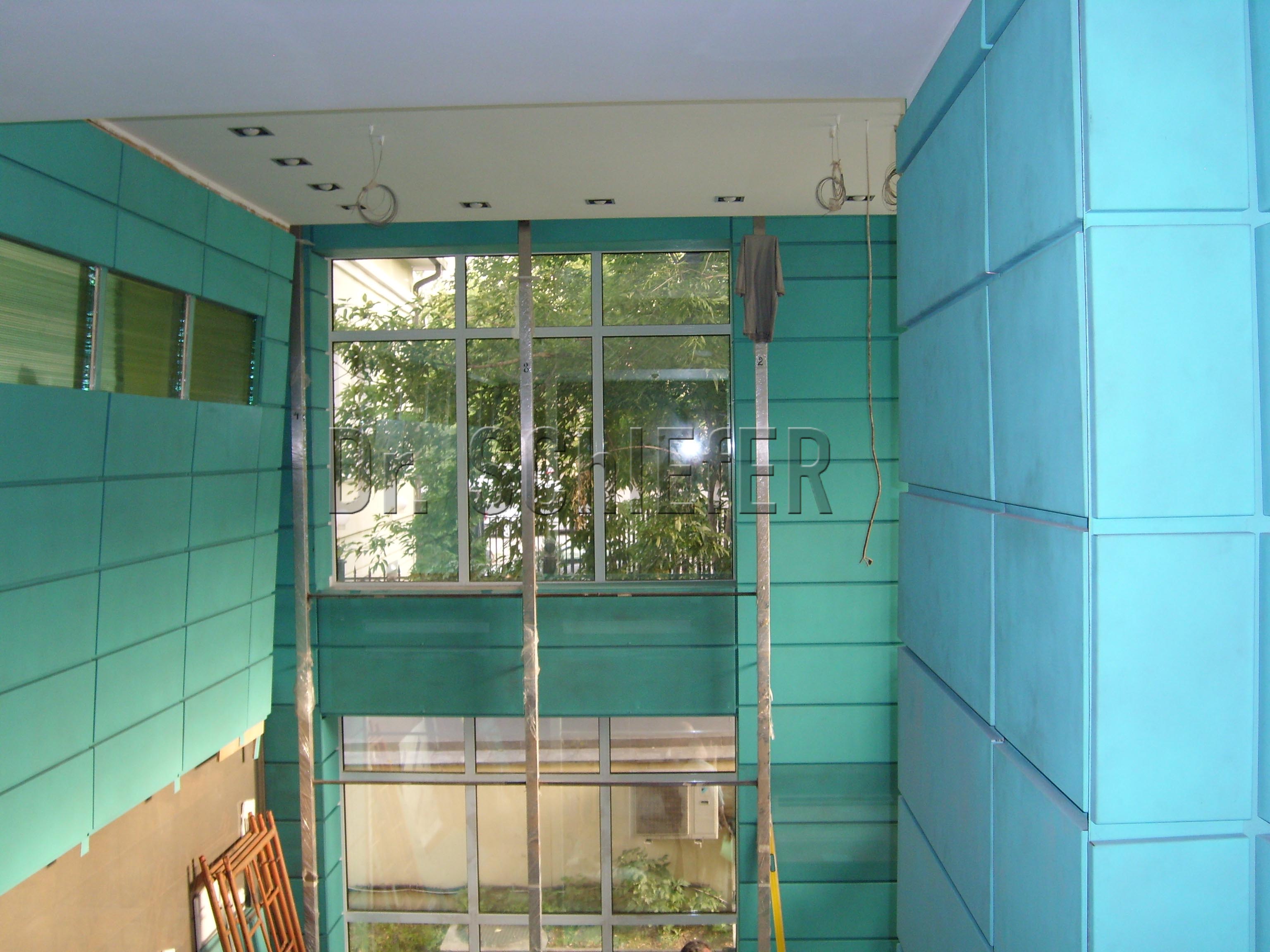 Сложность проекта заключалась в том, что на 200 кв.м. отделки было выполнено около 160 типоразмеров кассет, включая угловые. Зоны со встроенными кондиционерами закрывались перфорированными кассетами, которые не мешали работе оборудования.