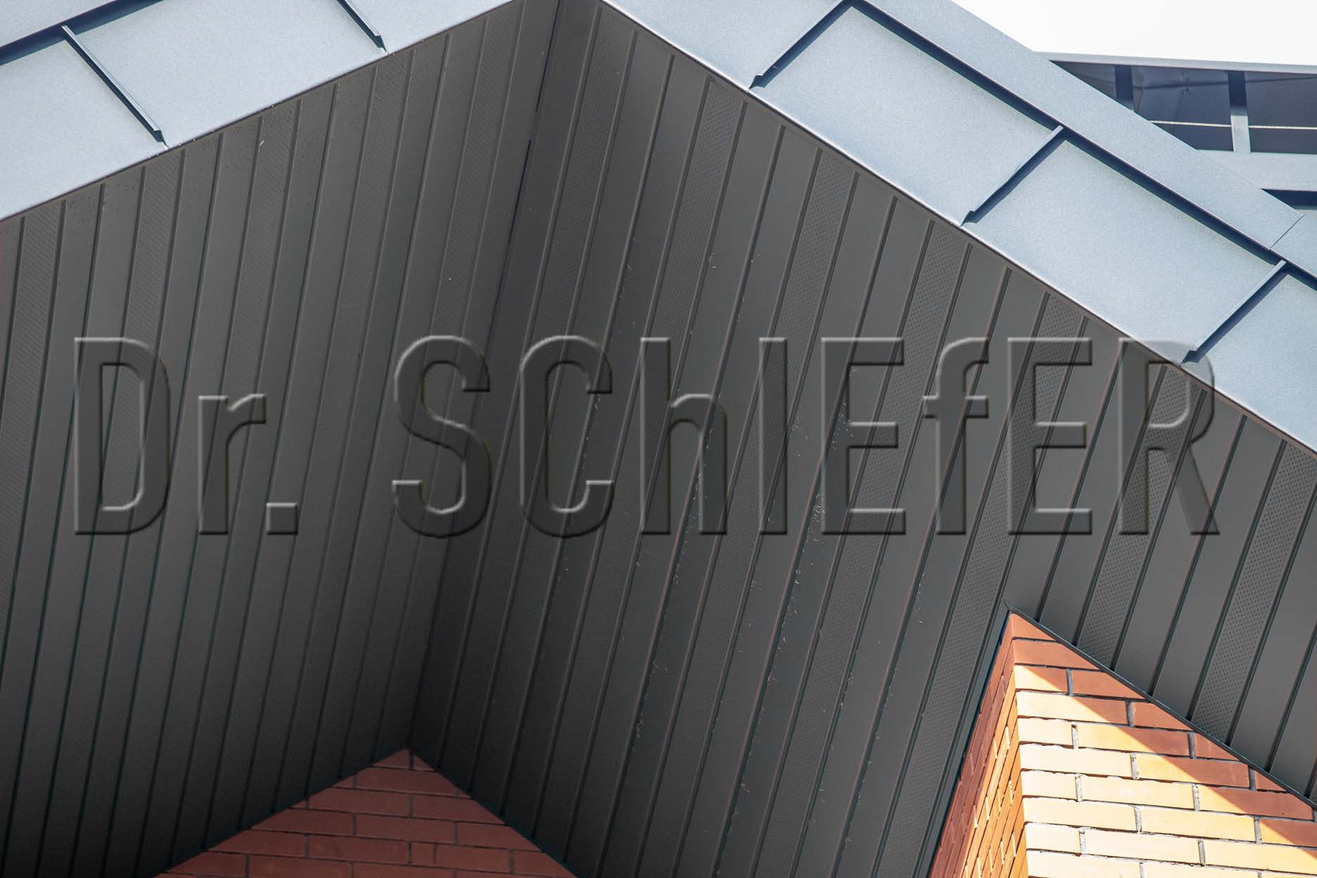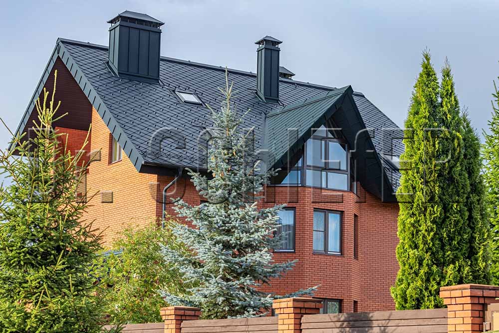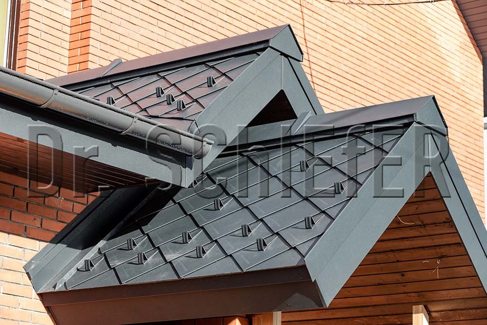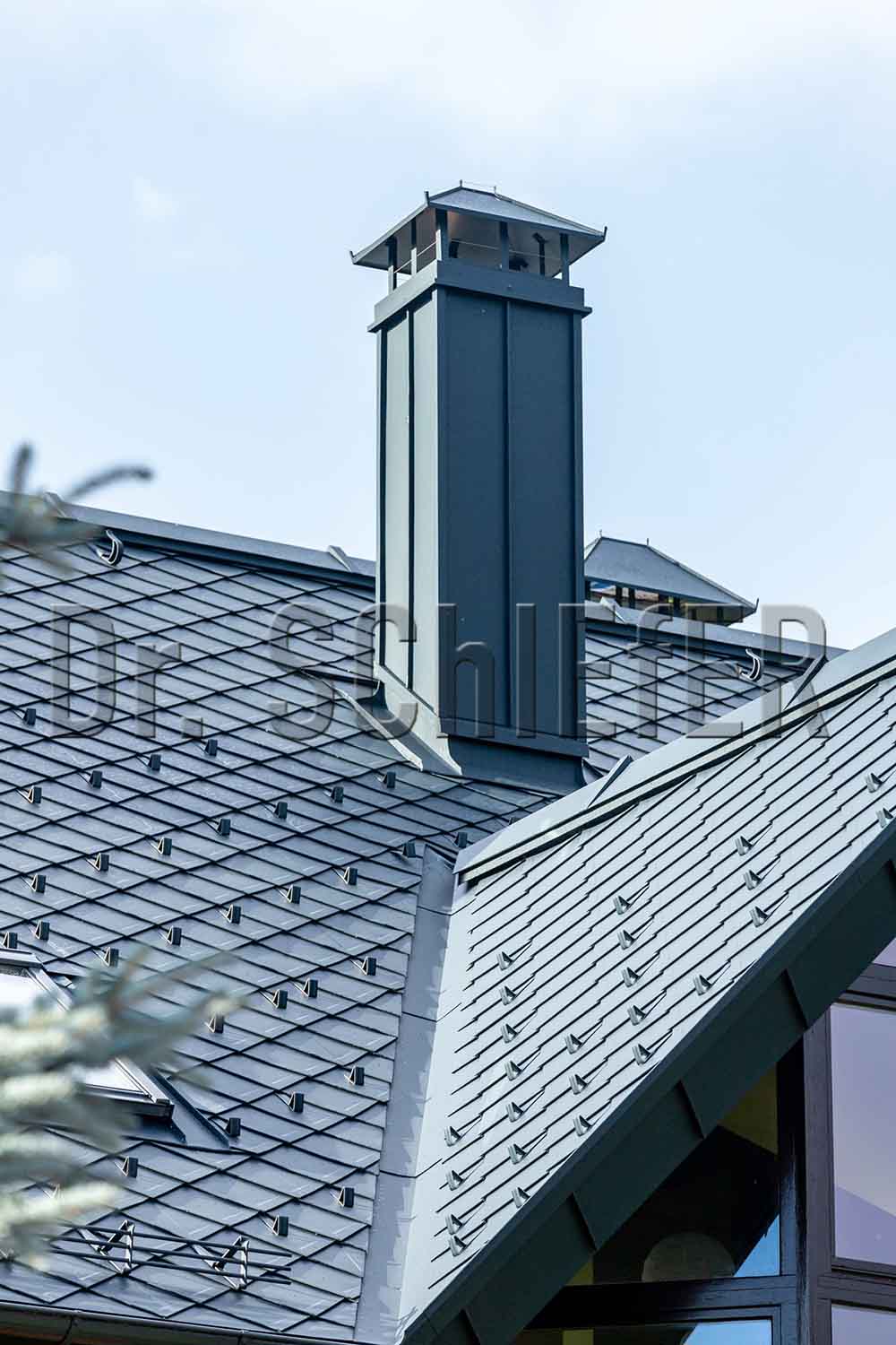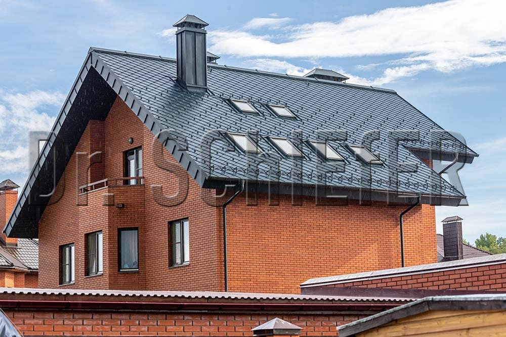 В последние годы все больший процент среди заказов занимают проекты с реконструкцией кровли, что, как правило, связано с заменой, пришедшего в негодность материала или исправление ошибок монтажа. На кровле данного дома лежала металлочерепица. Однако заказчика не устраивал внешний вид и цвет крыши. В качестве замены выбор пал на алюминиевую кровлю PREFA в цвете P10 Антрацит. Кровельные ромбы кардинально преобразили внешний вид дома. Скошенные эффектно выполненные фронтонные свесы, карнизы и труба, оформленные в технике двойного фальца изящно довершают внешний вид.