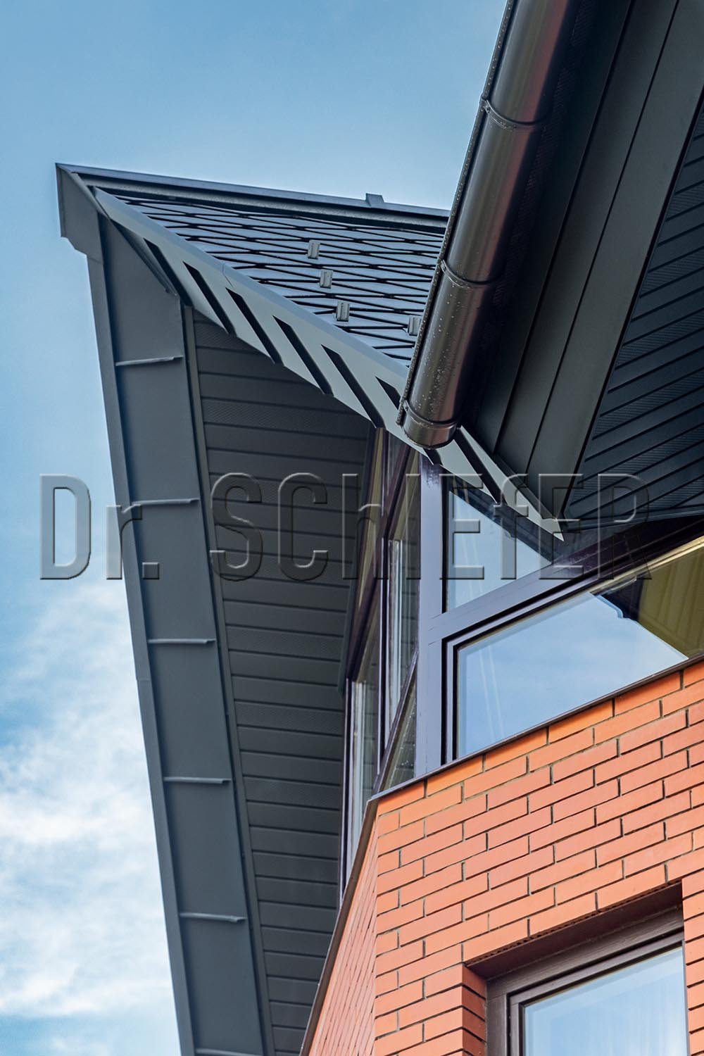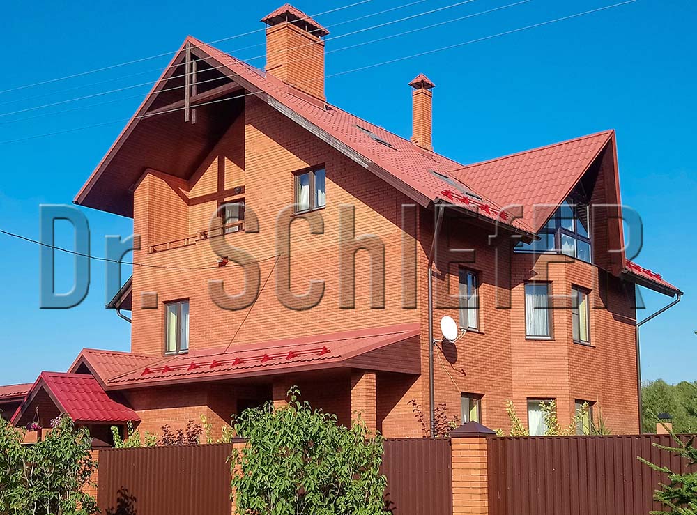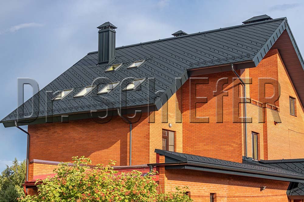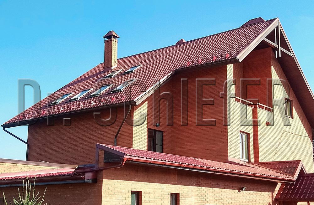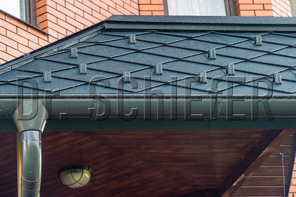 Трехтрубчатый ряд снегозадержания на карнизном свесе дополнен, распределенными по кровле, бугелями, что является оптимальным решением для крыш московского региона. Как и система безопасности, водосточная система размером 150/100 мм выполнена в цвет кровли. Все видимые элементы на крыше поставлены с одного завода – PREFA.