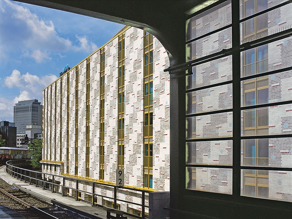И действительно: со стандартной малобюджетной концепцией отеля внешний вид нового здания имеет мало общего. Вместо этого известный берлинский архитектор Бенедикт Тонон разработал яркий проект бросающегося в глаза здания с необычным мозаичным клинкерным фасадом.