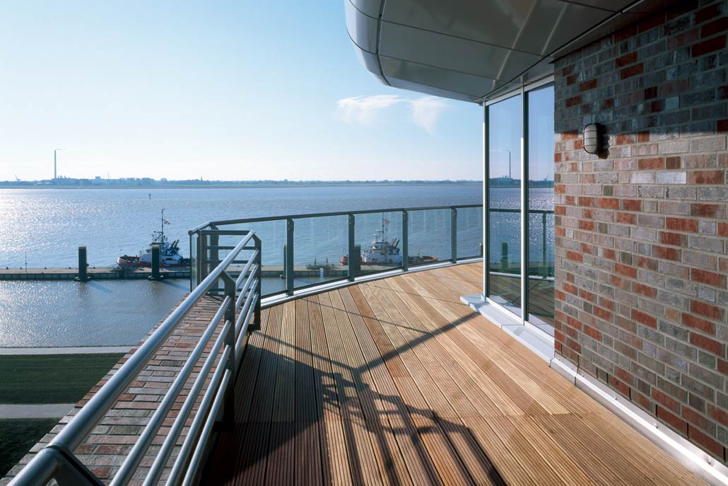 Стеклянные парапеты балконов гарантируют жильцам оптимальный вид через Везер. Для того, чтобы максимизировать срок использования балконов, они были остеклены специальными раздвижными стеклами.