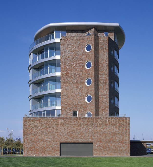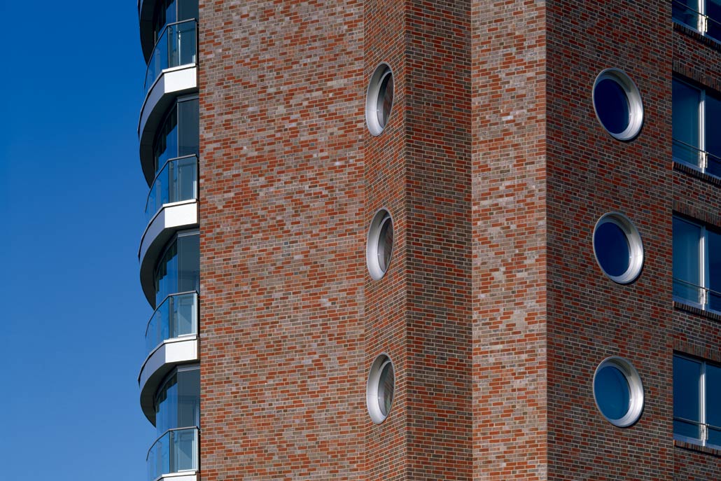 С эксклюзивным архитектурным клинкером Brick-Design® от компании Röben архитектор получил фасад, отражающий часто меняющиеся погодные условия на побережье. Красный и коричнево-голубой клинкер, иногда с пламенным оттенком, даже в серые дни придает зданию ослепительный блеск.