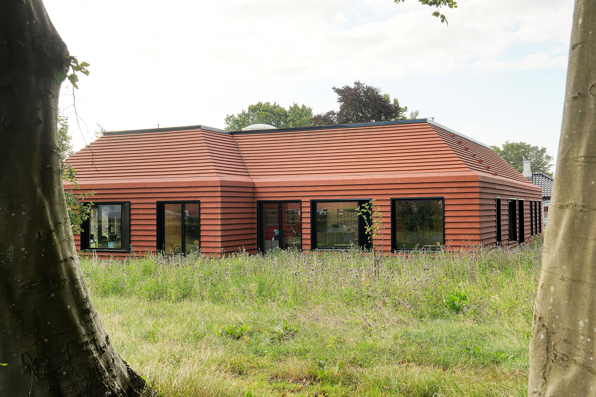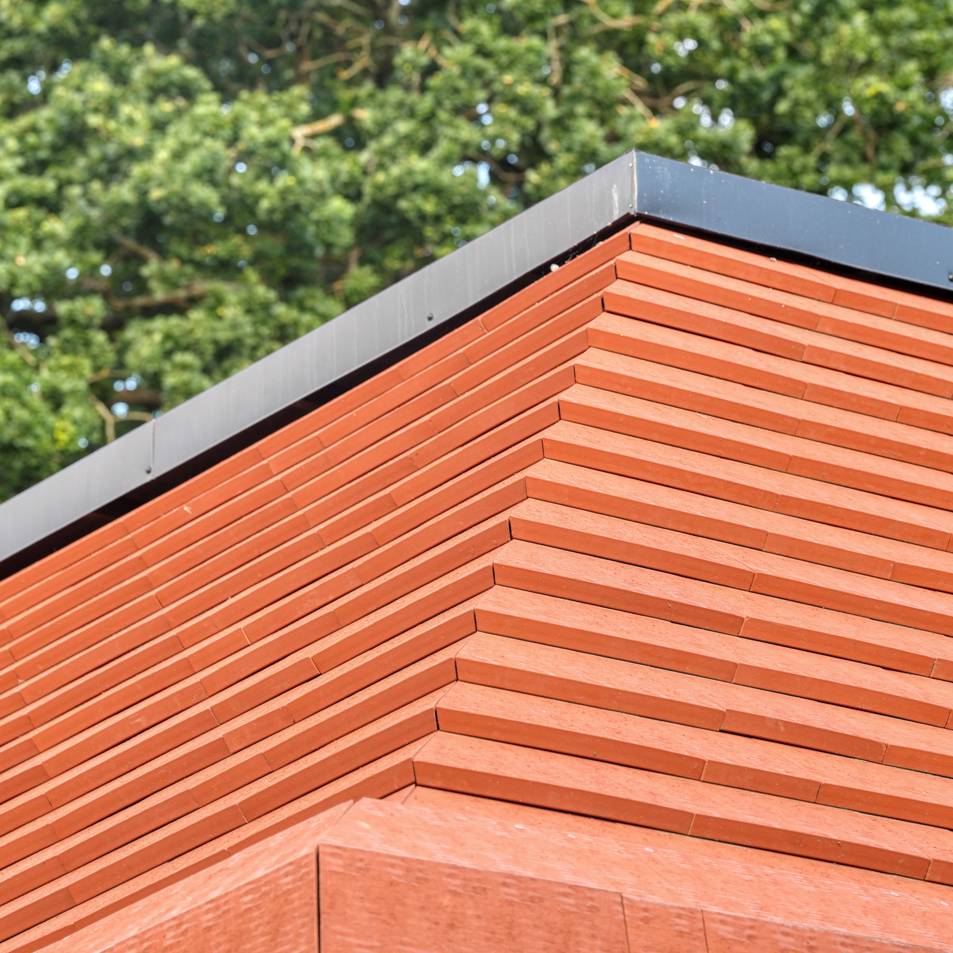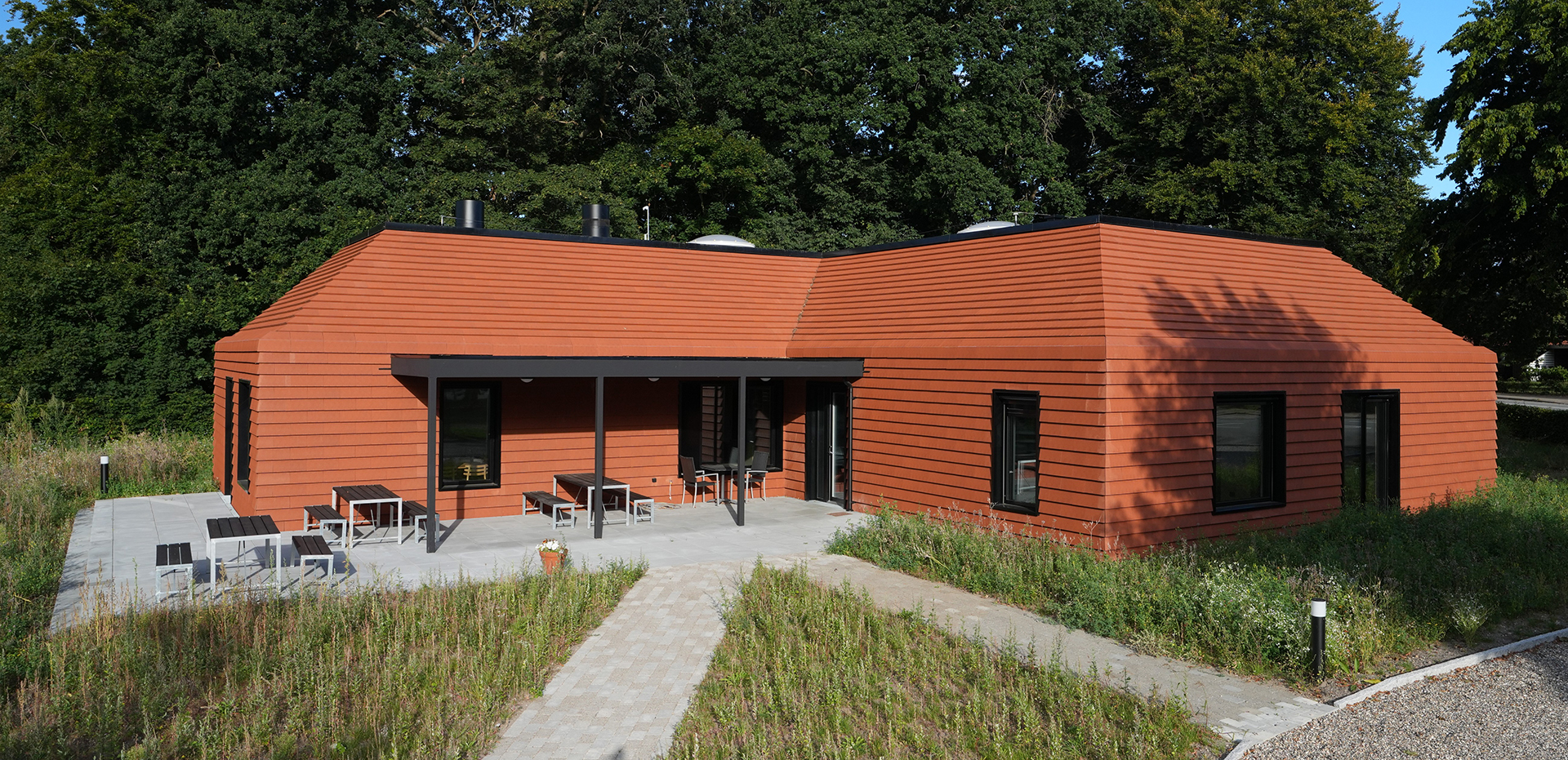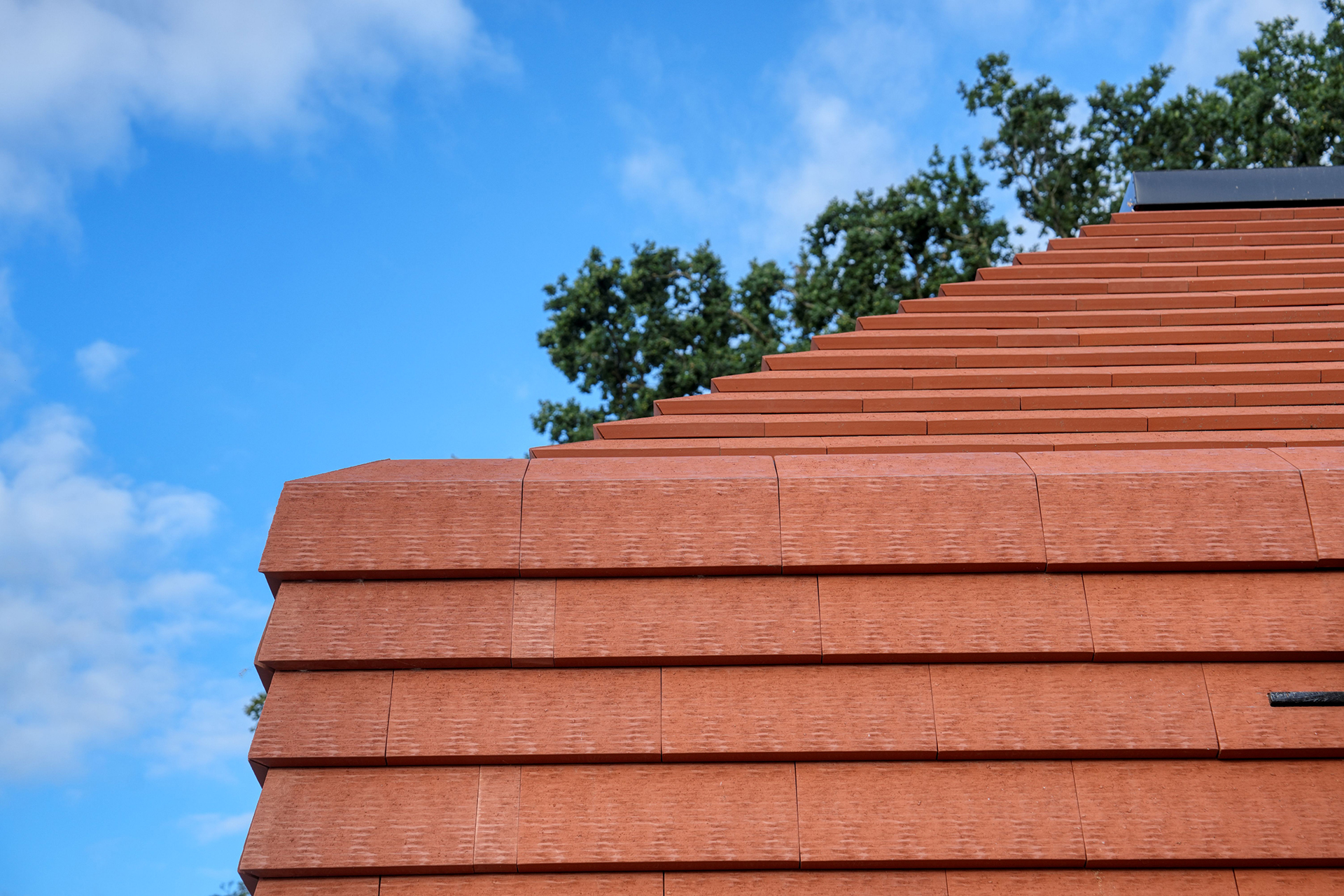 Благодаря эксклюзивной фасадной плитке V. Meyer-Holsen Vertico Facade, использованной как на крыше, так и на фасаде, здание выглядит как цельный и гармоничный памятник в ландшафте. Горизонтальные линии плитки создают динамичный и элегантный ритм, привлекающий внимание издалека, а текстура материалов и игра цветов располагают к созерцанию вблизи. Все фасадные плитки этого уникального здания крепятся с помощью фасадных зажимов, которые обеспечивают невидимое, но надежное и прочное крепление. Эти зажимы также позволяют легко и быстро заменить поврежденные фасадные плитки. На плоской, эксплуатируемой кровле оборудованы зенитные купола для прохождения естественного света в помещения.