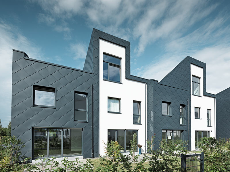 Скульптуральность в архитектуре всегда очаровывала международных звездных архитекторов из Лос-Анджелеса. Чтобы добиться этого эффекта в пригороде Берлина, бюро Lars Krückeberg & Co обшило 92 строения «Teltown» серебристо-металлической антрацитовой мерцающей оболочкой, «выполненной PREFA». «Мы искали материал, который мог бы покрыть и соединить крышу и стену».