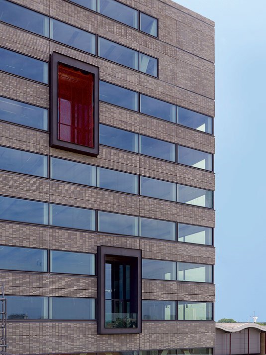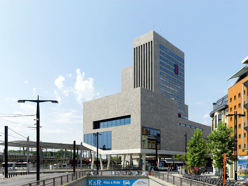 Для того, чтобы получить прочный и устойчивый к загрязнениям кирпич с малым уровнем влагопоглощения, архитекторы разработали керамический клинкер одного серого оттенка с экстремально низким влагопоглощением в 1,5%. Южный фасад, выходящий на привокзальную улицу и площадь был уложен именно таким кирпичом, привлекательно контрастирующим с большими окнами.