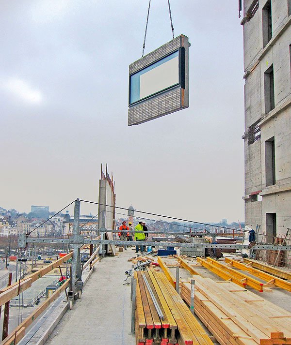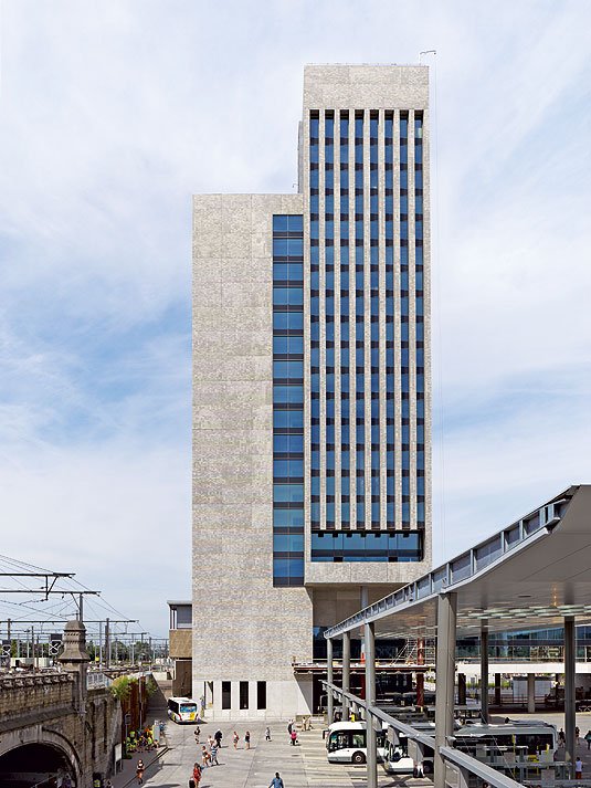 Проект архитекторов Poponcini & Lootens из города Антверпен представляет собой 90-метровую офисную башню с 22 этажами. В направлении северо-востока Г-образное здание завершается трехэтажным сооружением, в котором расположились общественные институты. Оно соединяет все здание с привокзальной площадью и образует «выход в город».