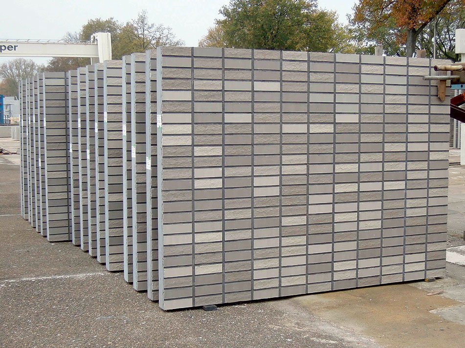Исходя из этого, получился очень разнообразный вид фасада с 50% структурированного кирпича из лицевой стороны и 50% рустикально-гладкой тыльной стороны кирпича. Важно было разработать точный макет такой сборной плиты, чтобы как следует перемешать светлые и темные камни.