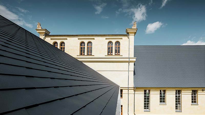 Алюминиевые гонты ПРЕФА – идеальный материал для исторической реставрации. Их вес – всего 2,5кг/м2, а толщина металла – всего 0,7мм. На старую стропильную ферму была уложена новая обрешетка и элегантные кровельные гонты в цвете антрацит. Местная компания Flashaar, уже работавшая с ПРЕФА, предпочла гонты размером 420 х 240 мм в цвете P.10 антрацит. Для того, чтобы уложить 5 тонн материала понадобилось около восьми недель работы на крыше.