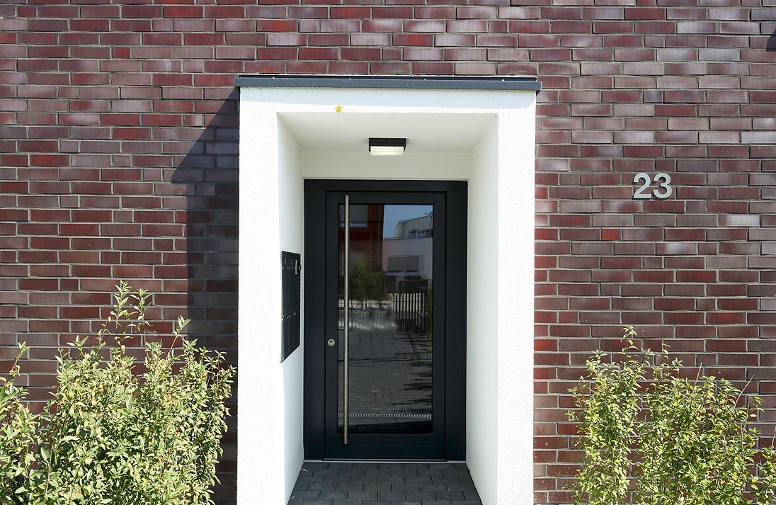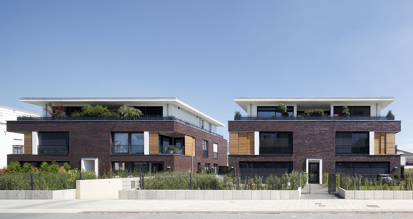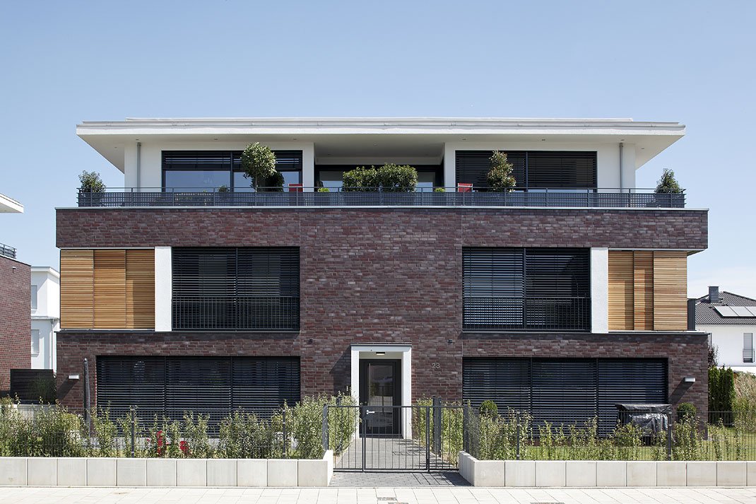 Для того, чтобы реализовать высокие требования к домам также в отношении фасадов, оба железобетонных дома были обложены высококачественной, долговечной и устойчивой к атмосферным воздействиям клинкерной плиткой. «Выбранная клинкерная плитка Röben- NEUMARKT бургунд своей живой синевато-красной игрой цвета делает акцент на местоположении и таким образом подчеркивает общую дизайнерскую концепцию всего квартала», рассказывает архитектор Корнелиус Шмитц-Хельбиг. К тому же камни превосходно гармонируют с выполненными из дерева «ширмами» на открытых террасах домов, а также с темными дверьми и оконными рамами.