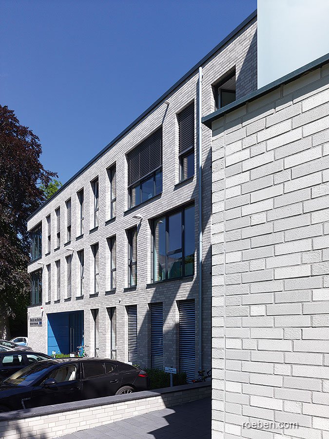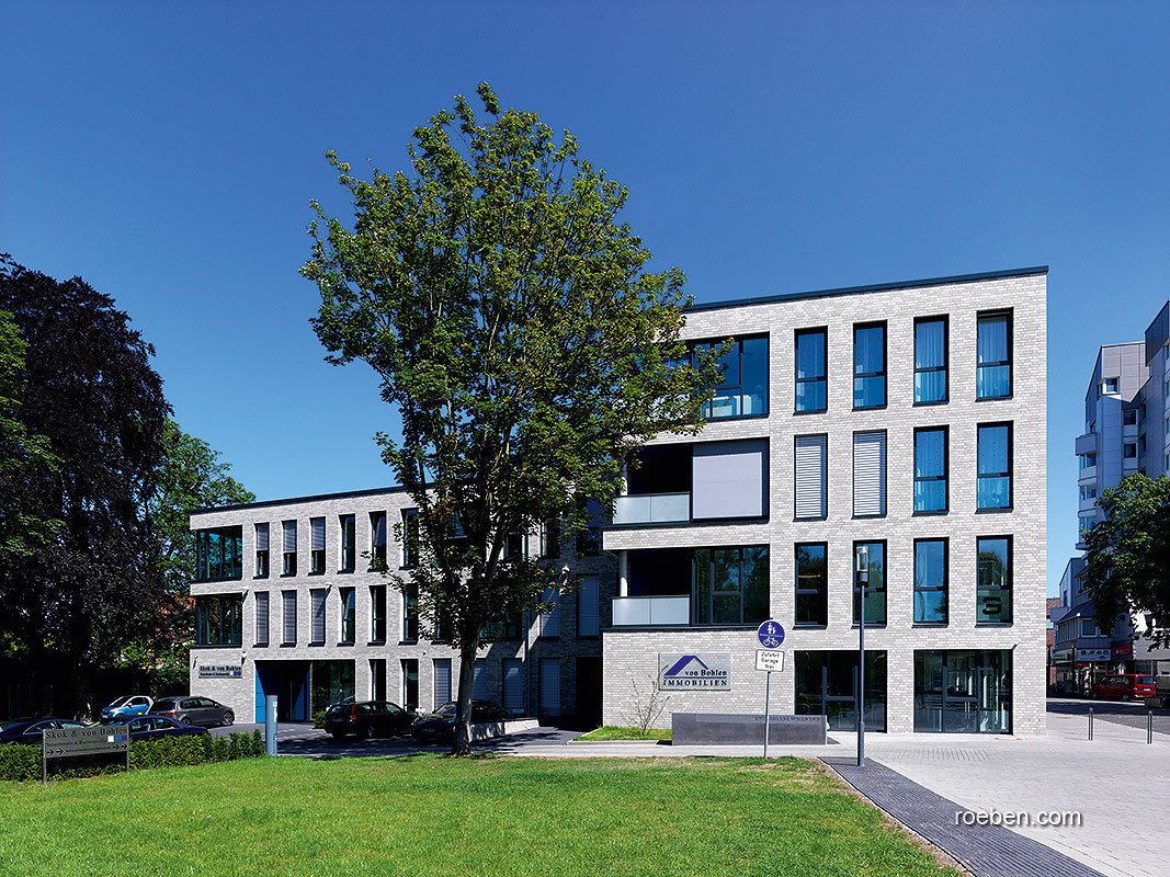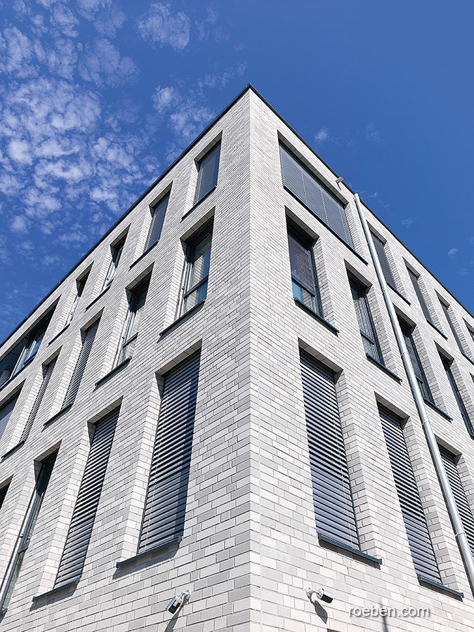 Со своим светло-серым клинкерным фасадом, здание представляет мощную конечную точку в центральной застройке города и благодаря своей угловой форме одновременно находится на двух улицах сразу, облагораживая каждую из них.