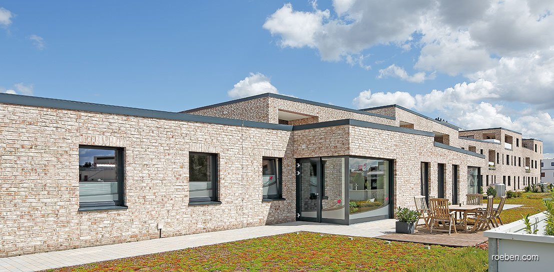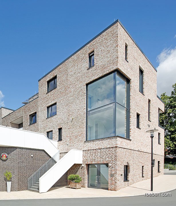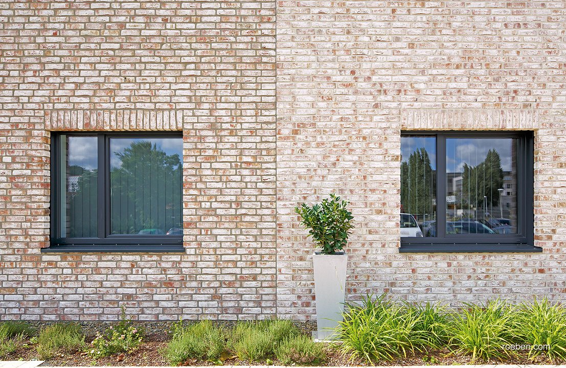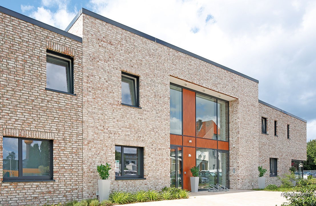 Кирпич фасада такого объемного здания ни в коем случае не должен был быть «тяжелым» и темным. Так после долгого мониторинга кирпичного рынка архитекторы остановились на кирпиче GEESTBRAND пестро-белый от компании Röben. Выбранный кирпич ручной формовки имеет живую, приятную светлую поверхность, и каждый кирпич отличается по текстуре и оттенку от остальных.