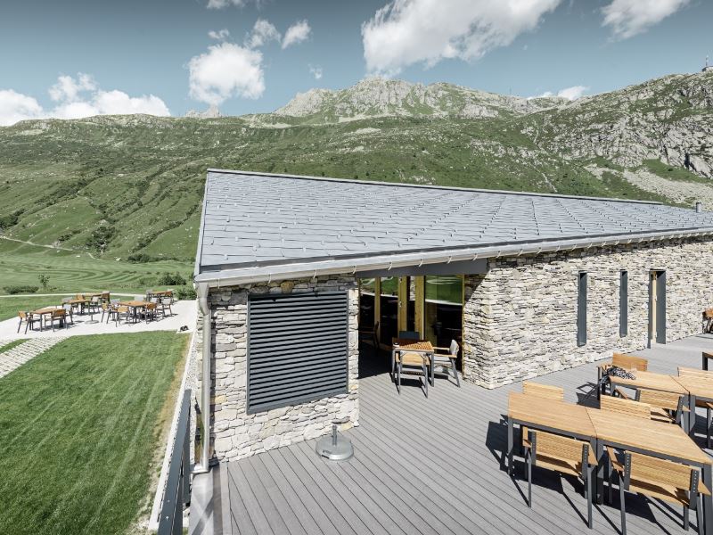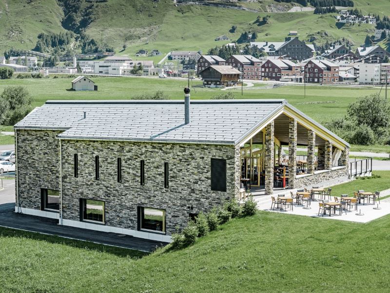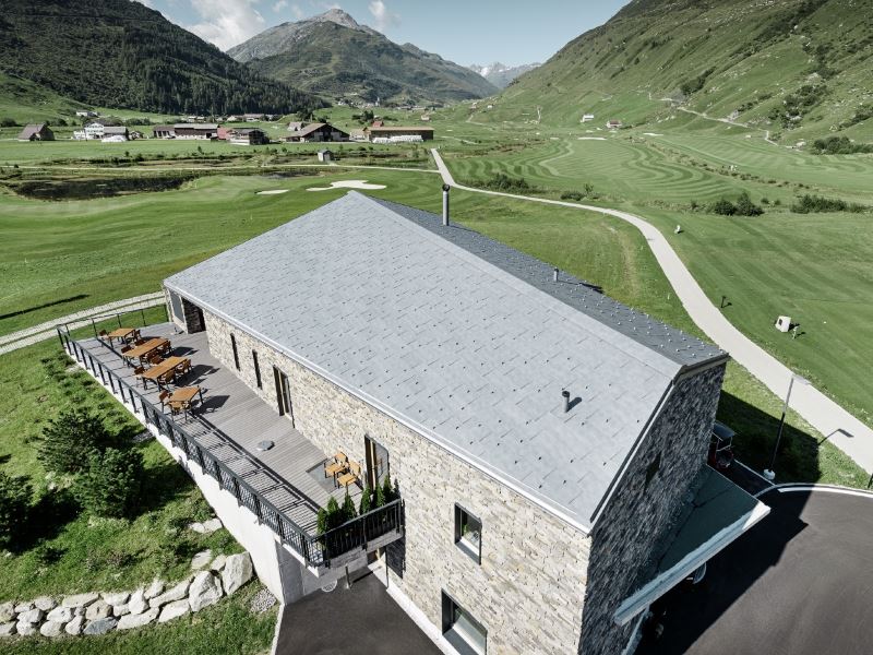 Уникальный гольф-клуб посреди Швейцарских Альп. Одним из наиболее привлекательных зданий инновационного проекта Andermatt Swiss Alps является новый гольф-клуб c привлекательной архитектурой и выделяющейся кровлей. Комбинация легкой, филигранной кровельной кладки и уложенных друг на друга тяжелых камней фасада идеально подходят под скупой горный ландшафт.