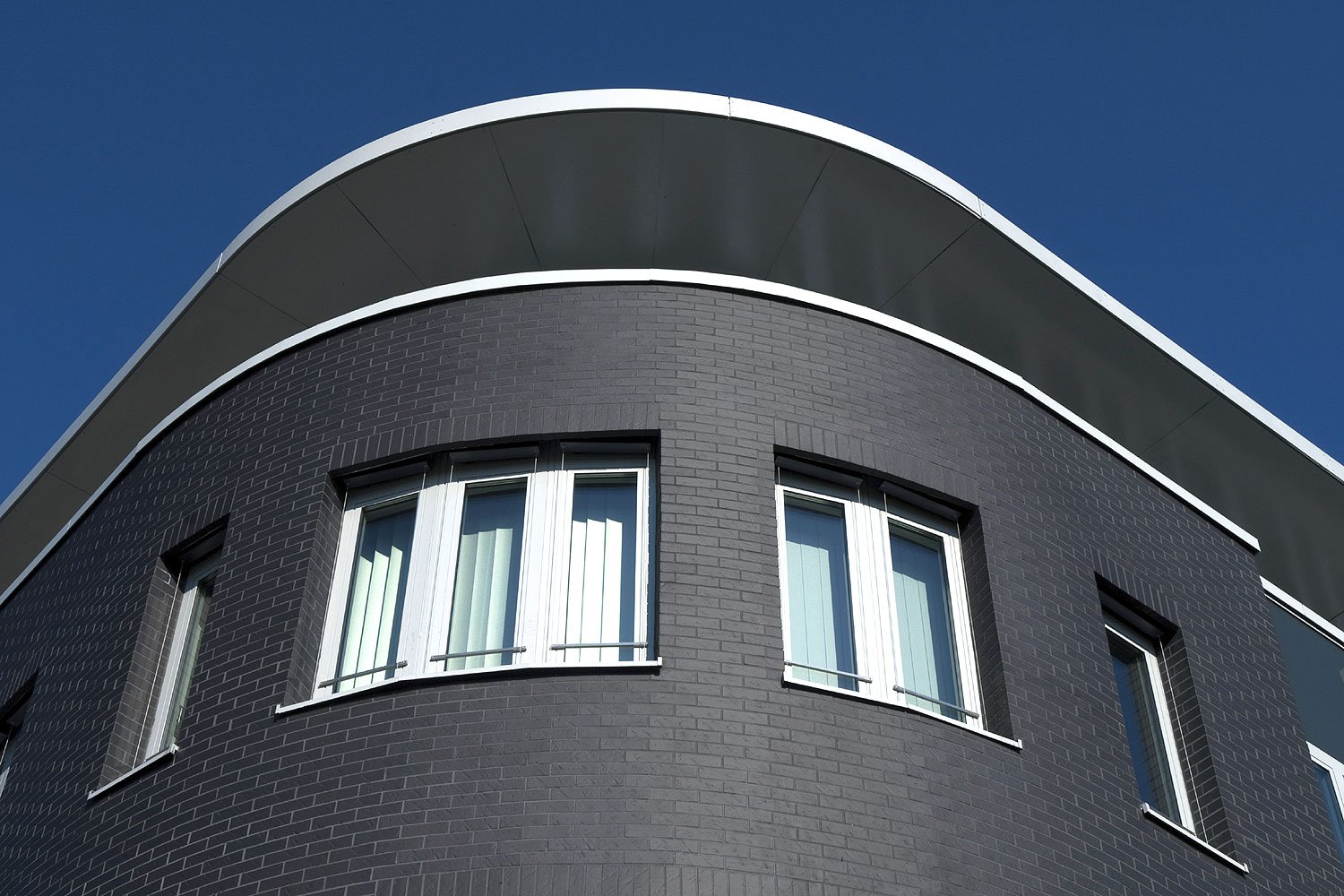 Для фасада была использована плитка формата NF. Цвет решено было использовать однотонный, без вкраплений, пятен, пестроты, так как иначе и без того сложный фасад здания с окнами разной величины, их ассиметричным расположением, смотрелся бы неказисто и аляписто. Была применена спокойная традиционная ложковая кладка кирпича и "на ребро" были поставлены плитки только в пространстве над оконными проемами для достижения традиционного вида кирпичного здания.