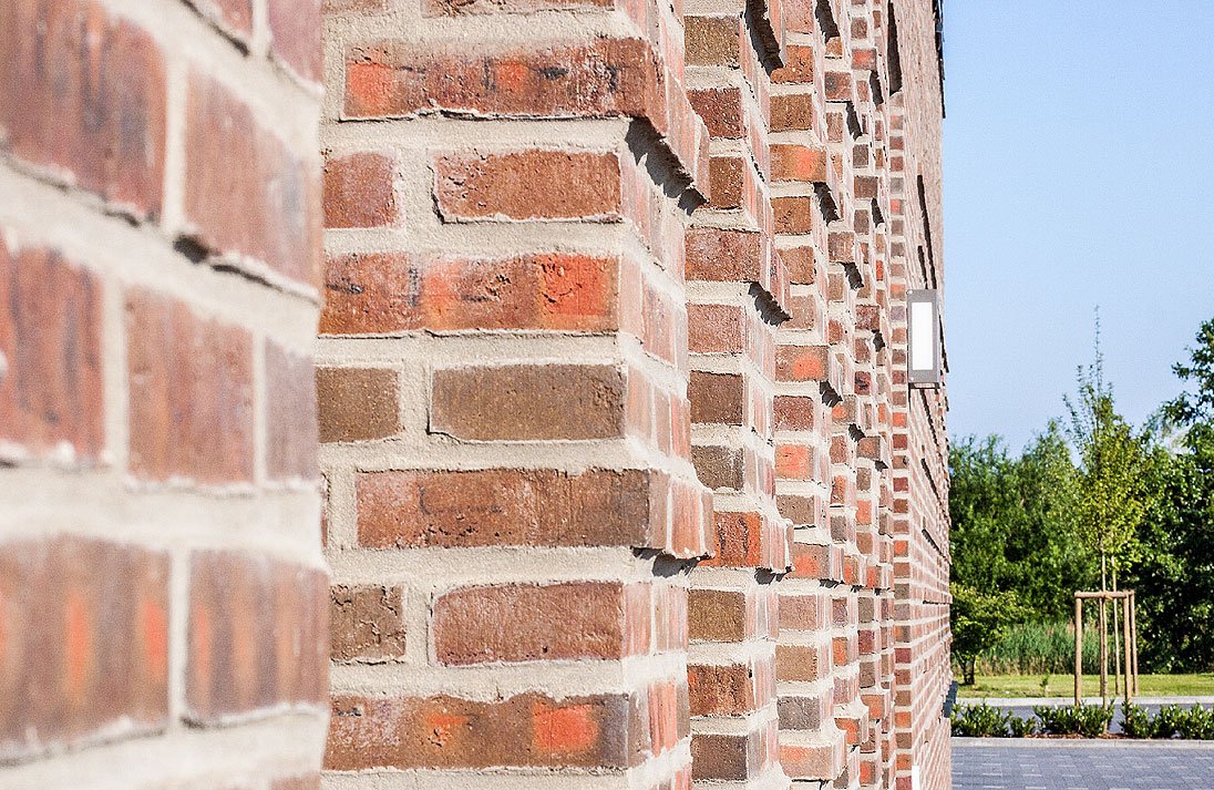 Несущая бетонная оболочка была облицована кирпичом. Красный цвет клинкера был предусмотрен согласно планам архитекторов. Среди образцов рассматривались многие темно-красные кирпичи различных производителей. В соответствии с многими критериями и также после визуальной проверки выбор пал на светлый вариант кладки кирпича WIESMOOR угольно-серый в формате DF. Дизайнеры Ребен Brick-Design® по настоянию заказчика добавили в исходный кирпичбольшую составляющую красного цвета.