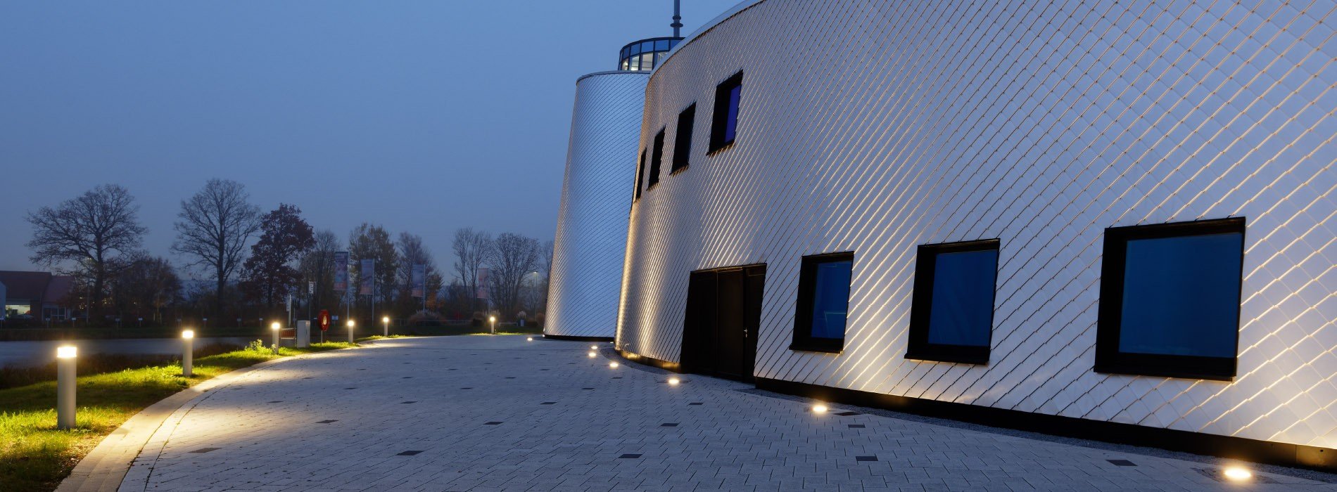 Выбор материала для круглых строительных конструкций пал на алюминиевые гонты PREFA: было уложено около 3000 м² гонтов в формате 20 x 20 см, всего 73 000 штук. Таким образом, ИЭЗ получил устойчивый к штормам и атмосферным воздействиям фасад, качество которого гарантируется в течение не менее 40 лет. Архитектор Лотар Табери объясняет решение в пользу ромбов PREFA: «Относительно маленькие алюминиевые ромбы идеально подходят для облицовки изогнутых, частично наклоненных на семь градусов и конических фасадов. Из-за небольшого размера конструкции панели, такая геометрия здания, которую мы создали здесь, может быть обработана без каких-либо проблем». Там, где обычные фасадные материалы необходимо обновлять или, по крайней мере, ремонтировать через несколько лет, алюминий прослужит десятилетиями. Алюминиевые гонты также способны справиться с эстетическими требованиям: на примере ИЭЗ, с гонтами натурального цвета с прозрачным покрытием, здание сияет как «маяк» далеко в восточно-фризском ландшафте.