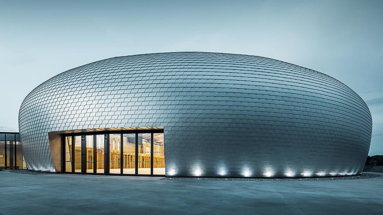 Современное здание в своей необычной эллиптической форме привлекает внимание и вдохновляет. Спортивная площадка размером 45 × 25 метров может вместить 250 зрителей. Таким образом, она может быть использована не только для спортивных занятий детей, но также является местом проведения местных спортивных и культурных мероприятий. Сложная и привлекательная архитектурная концепция с пространственной эллипсоидальной формой является ответом на текущие требования и неизвестное будущее. При ее виде на ум приходят ассоциации с НЛО. «Когда зал освещается ночью, а в небе сияют огни, вы думаете: приземлился НЛО», - говорит Алеш Кубалик. Зал имеет круглую, гладкую и абстрактную форму. Металлическая поверхность отражает окружающую среду, и границы между небом и крышей становятся размытыми. В дополнение к их прогрессивной, смелой концепции для архитекторов всегда было важно соединять воедино практические функции здания и людей, использующих его. «Мы разработали спортивный зал для детей, ведь всегда важно, где дети тренируются. Уверен, здания оказывают значительное влияние на людей», - говорит Якуб Нашинец.