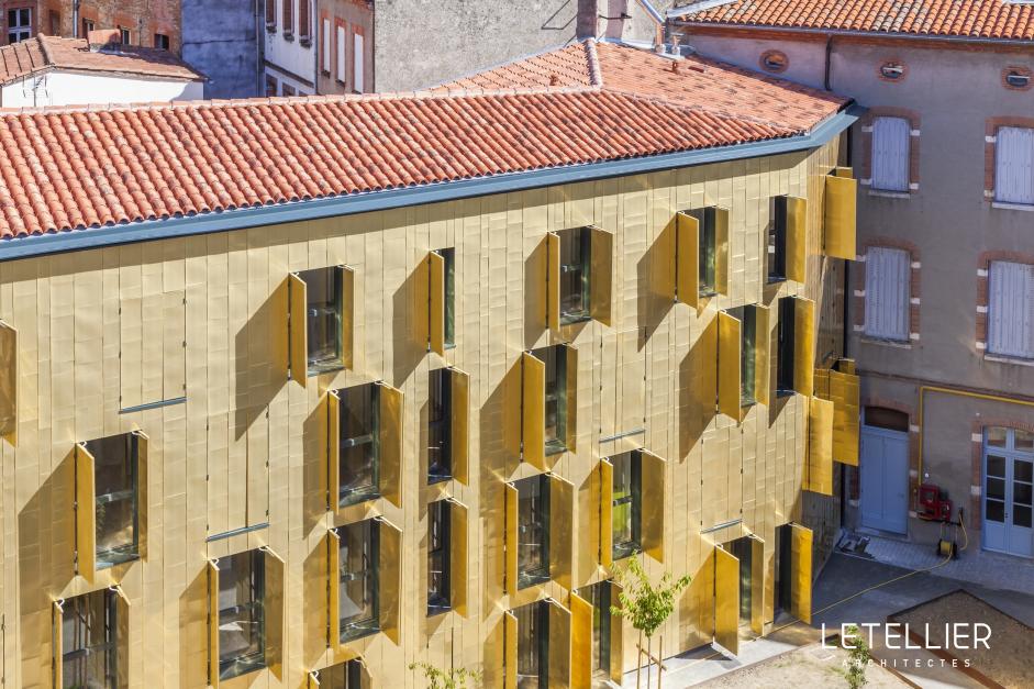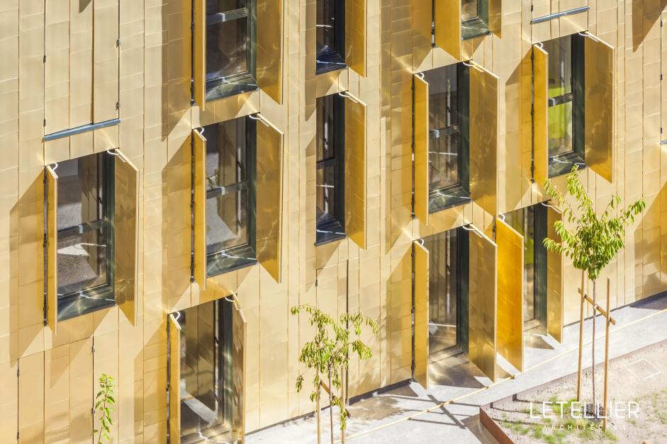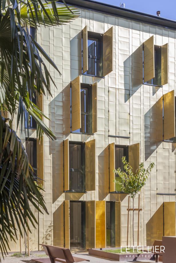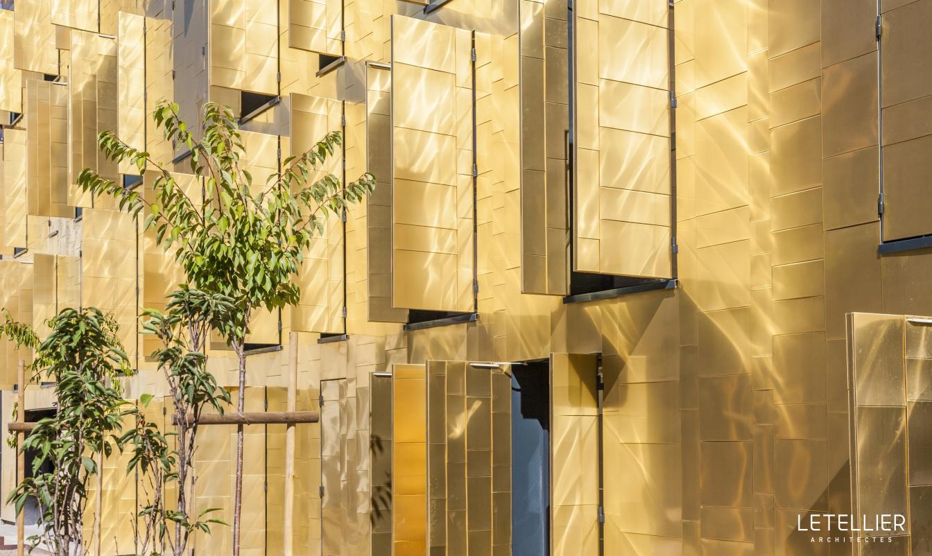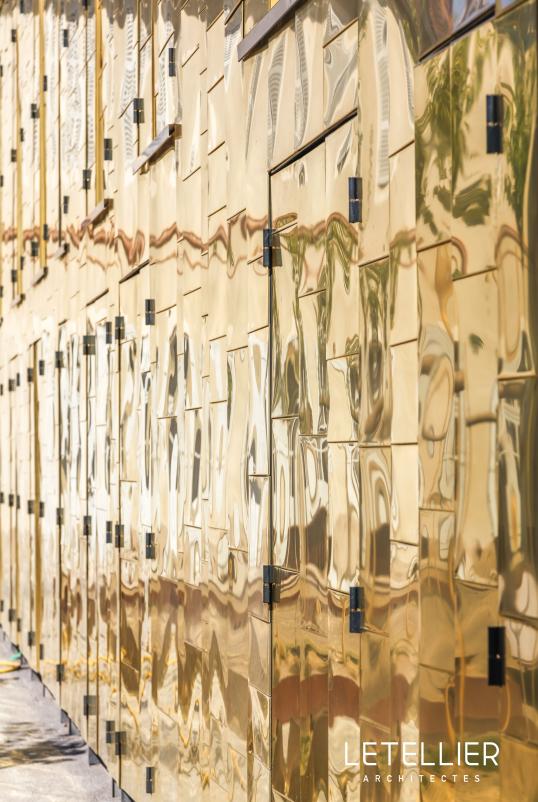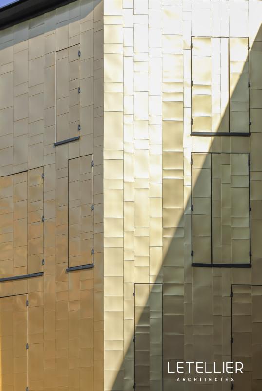 Четыре этажа фасада снаружи покрыты медными листами TECU® Gold и снабжены случайными оконными проемами. TECU® Gold был выбран для того, чтобы отдать должное традиционному историческому характеру этого места, а так же создать впечатляющий световой эффект высокой утонченности и элегантности.