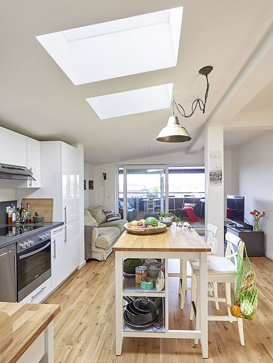 Не использованный ранее чердачный этаж этого многоэтажного дома был теперь дополнен тремя арендными квартирами с привлекательной современной планировкой и открытым пространством (площадью около 30 м2, 50м2 и 70м2). «Особенную роль здесь играет выбранное расположение мансардных окон. Благодаря им жилое пространство в разное время суток выглядит совершенно по-разному», восторгается Текеоглоу.